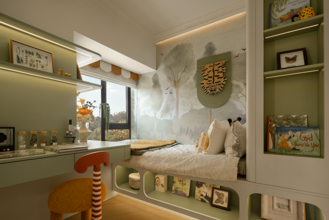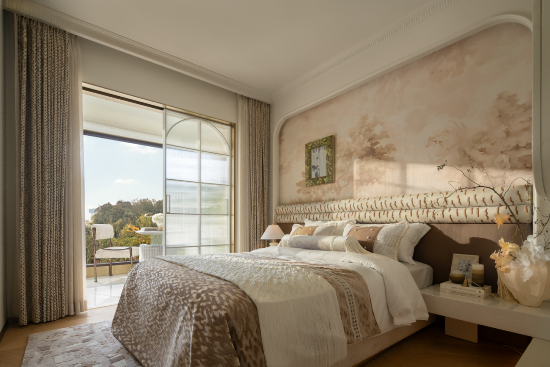 长辈房以奶油杏、浅咖、米白为核心色调,低饱和的柔和铺就身心安歇的底色。背景墙通过艺术墙布打造出朦胧温润的春日和煦之感,搭配田园风格床品让温柔的气息在空间中蔓延。大面积的法式风移门连接阳台空间,通透的格局让外部的天光、绿意、柔风都自然涌入,法式优雅被自然的恬静与生机包裹,一段美好的颐养时光等待长辈邂逅。