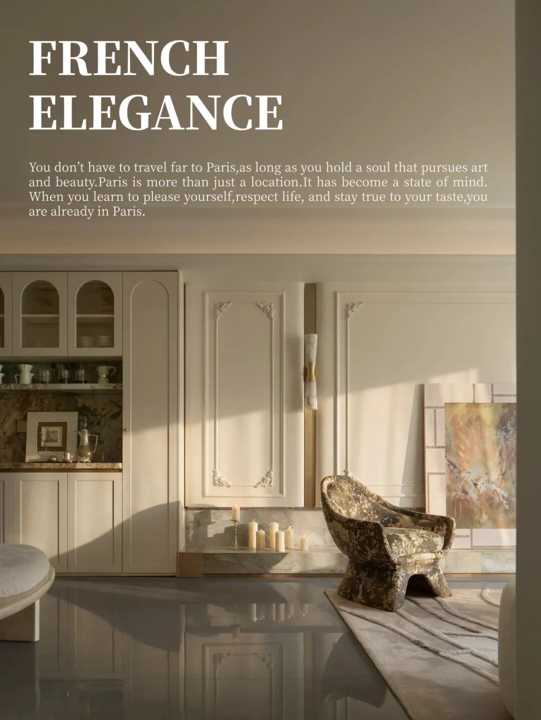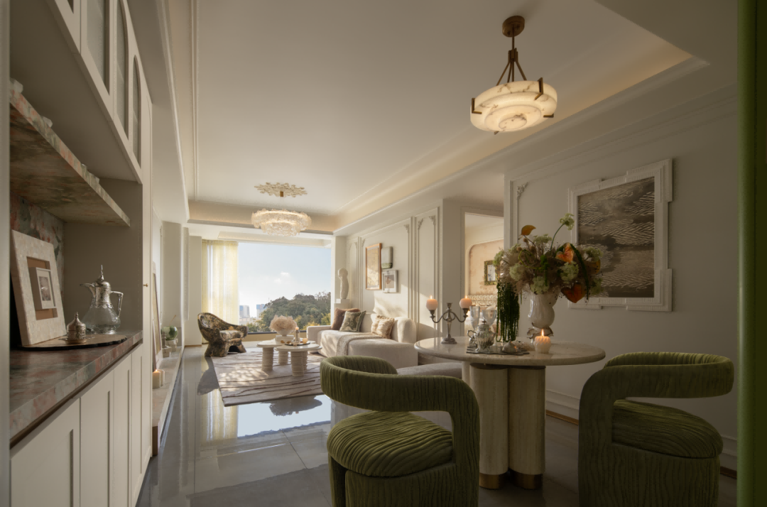 轻奢质感的大理石餐桌与绿色丝绒椅体现主人对质感的追求,古典风情的烛台、茶器、台花是法式优雅最显化的表达形式。每一件单品的精致外在,都在诉说巴黎艺术化的日常,刻写法式最内核的基因。