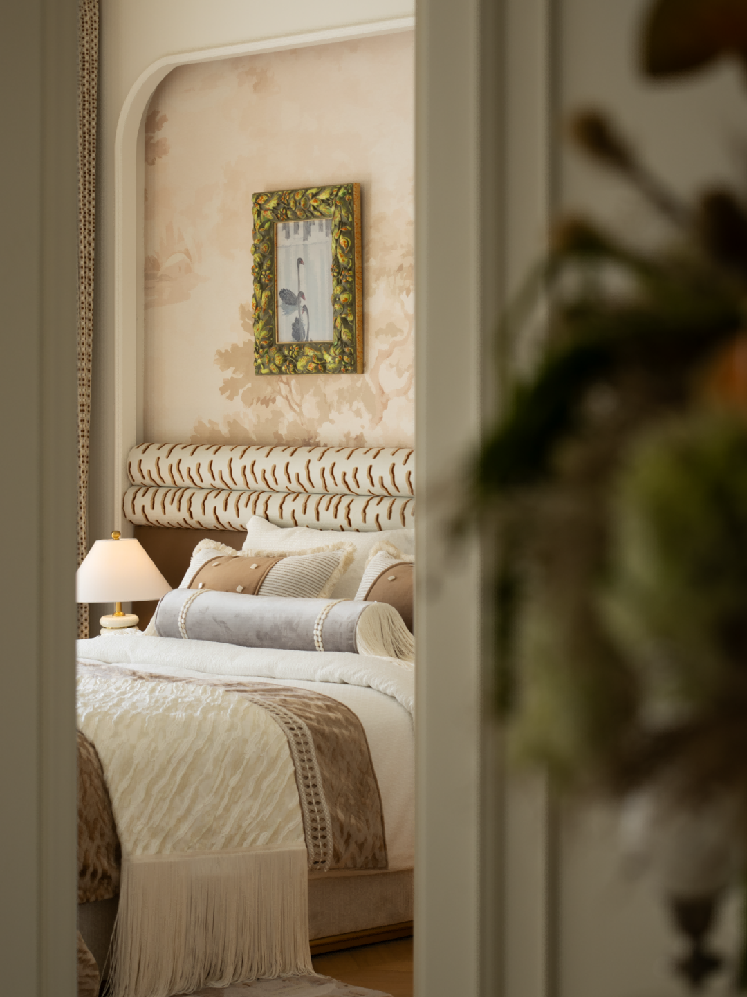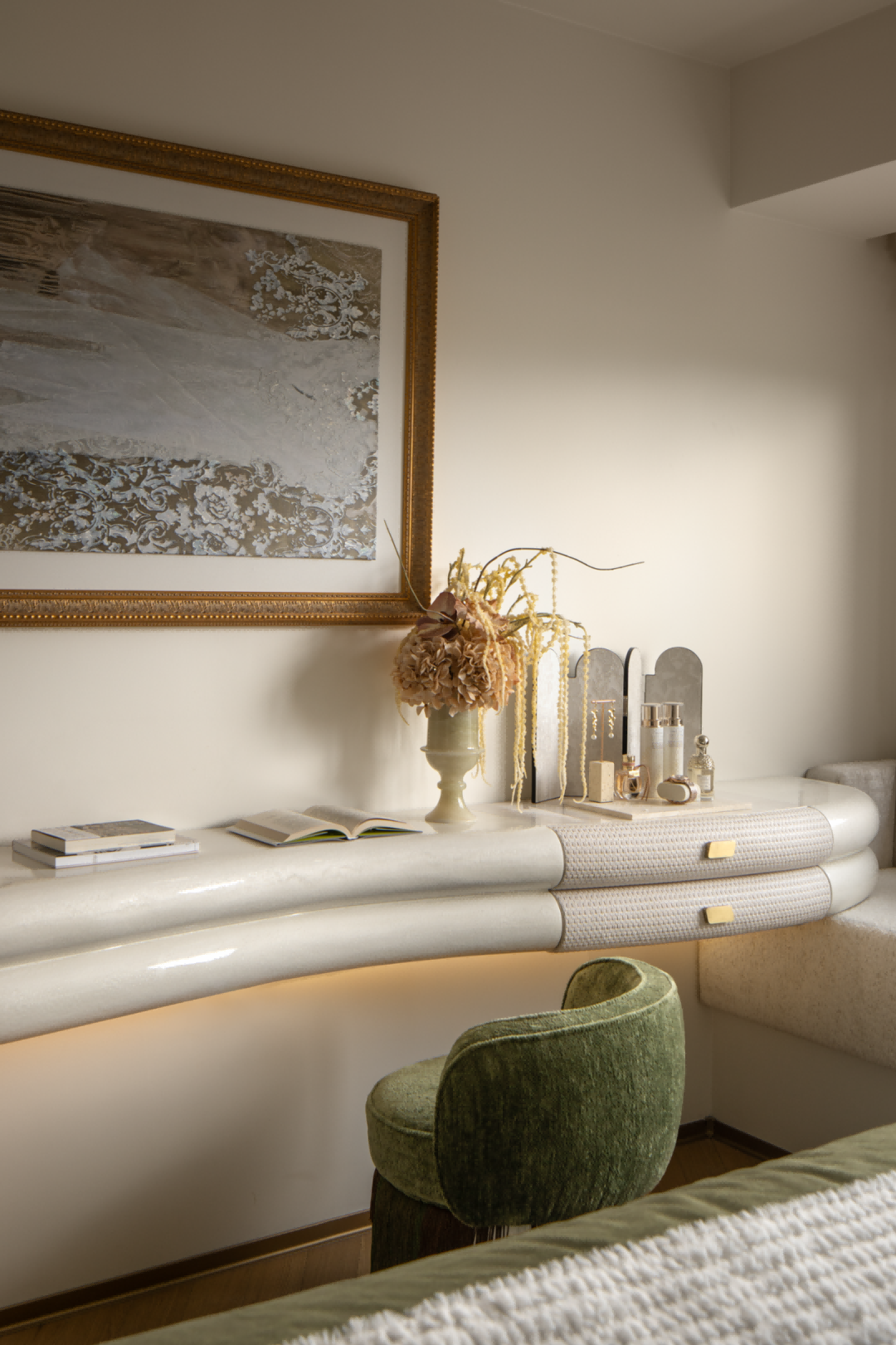 床屏上方立体挂画通过层层叠加的肌理呈现绽放的姿态和一种可触摸的温柔质感,赋予空间柔和松弛的呼吸节律。古铜金色吊灯拥有精巧的层次设计,造型复古又不失灵动,呼应着法式细微处见精致的调性。床品搭配绸缎、丝绒、立体毛线针织多重肌理,带来丰盈的视觉质感。