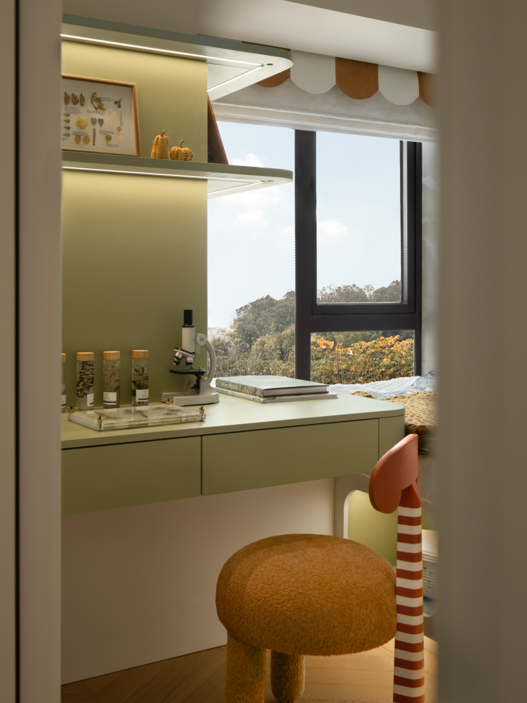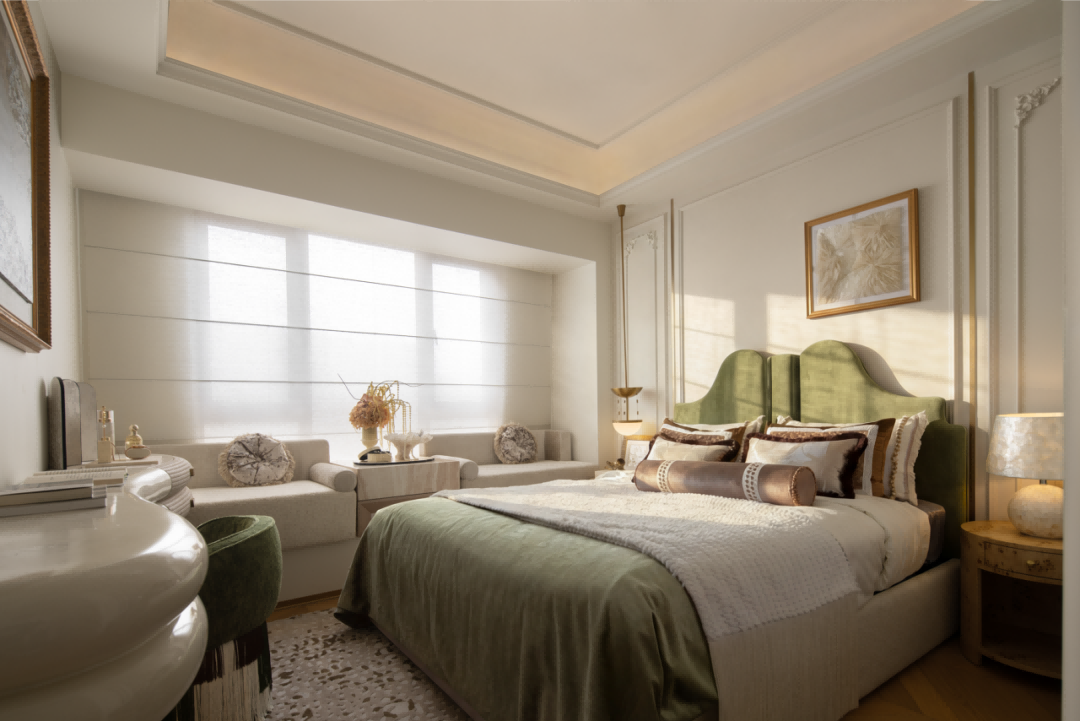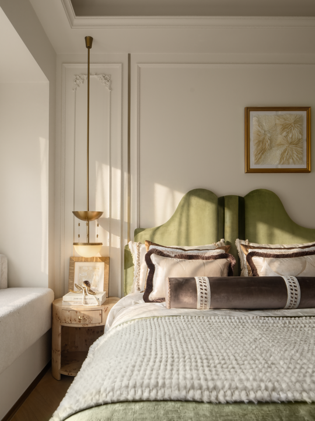 主卧室利用橄榄绿、米白、浅杏等配色渲染了明媚平和的春意,让主人仿佛置身春日林间享受到与自然近距离对话的治愈力。软装撷取了法式宫廷风的精髓,又做了很多化繁为简的精妙处理,让法式复古线条的经典之美得以呈现,又兼顾了现代追求的利落感与实用舒适性。法式对称的秩序美感在主卧中多处体现,为卧室营造出高级的整洁感与稳定感。而通过饰品、灯饰、挂画的不对称修饰,又适当打破秩序的沉闷,提升了空间的个性张力。