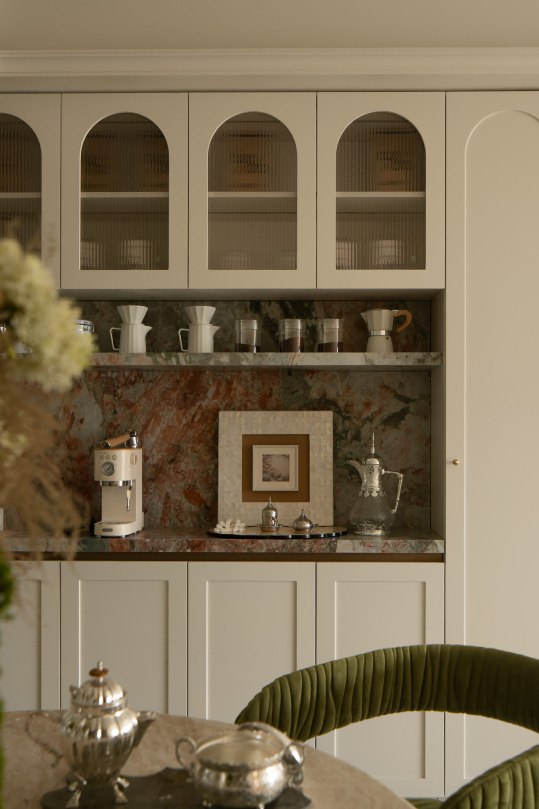 餐边柜是经典的法式珍珠白配以粉绿斑斓石纹,精致的咖啡器皿摆放其上,带着点点怀旧韵味。咖啡的幽香带领你寻访那片追求仪式感的精神土壤,品味那香醇带来的感官以外的满足。